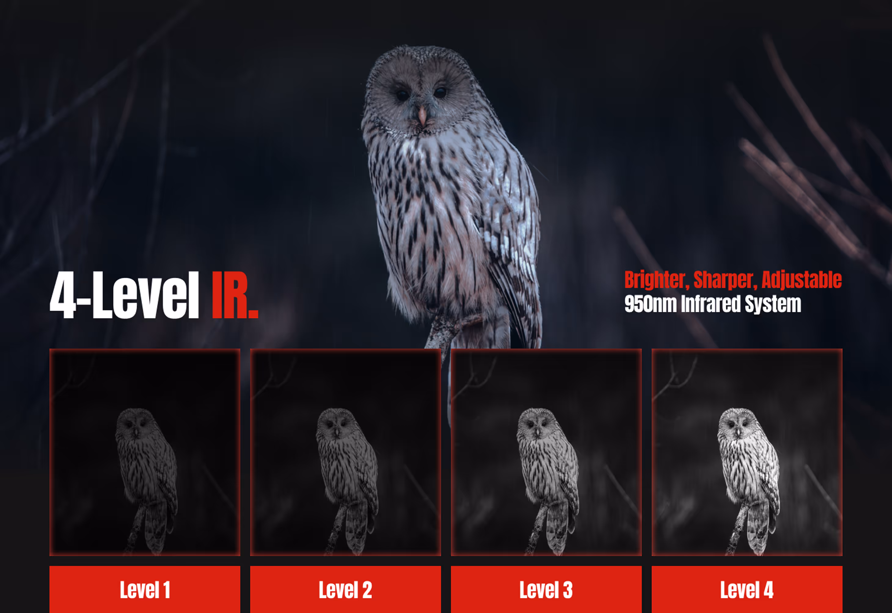 Old tech fires 850nm and exposes you with a red glow. Night Storm X3 doesn’t. Its boosted 950nm infrared system is fully invisible to the naked eye and nearly undetectable to animals, illuminating 0-lux darkness without revealing your position. You get high-contrast monochrome with up to 30% sharper clarity than standard IR, plus 4 adjustable intensity levels to stay hidden and in control.
